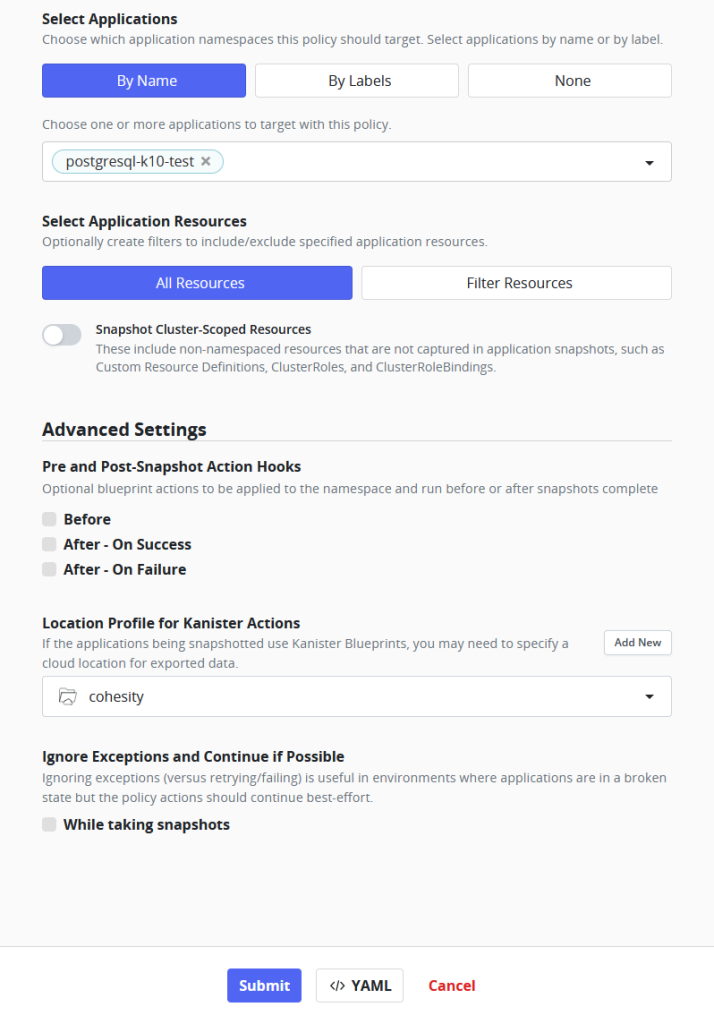 We can apply it trough CLI or trough Kasten UI under Blueprints > Blueprints > Create New Blueprint